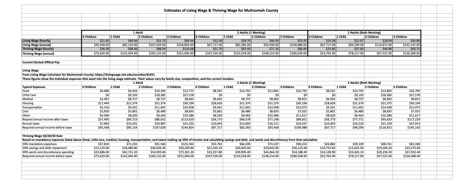 You can see an enlightening breakdown of survive vs. thrive wages needed for households of various sizes in Multnomah County below. On a personal note, I’m currently earning more than I ever have and my household still doesn’t fall in the thrive category. And boy do we feel it (I don’t think this spreadsheet takes into consideration how much teen boys eat).